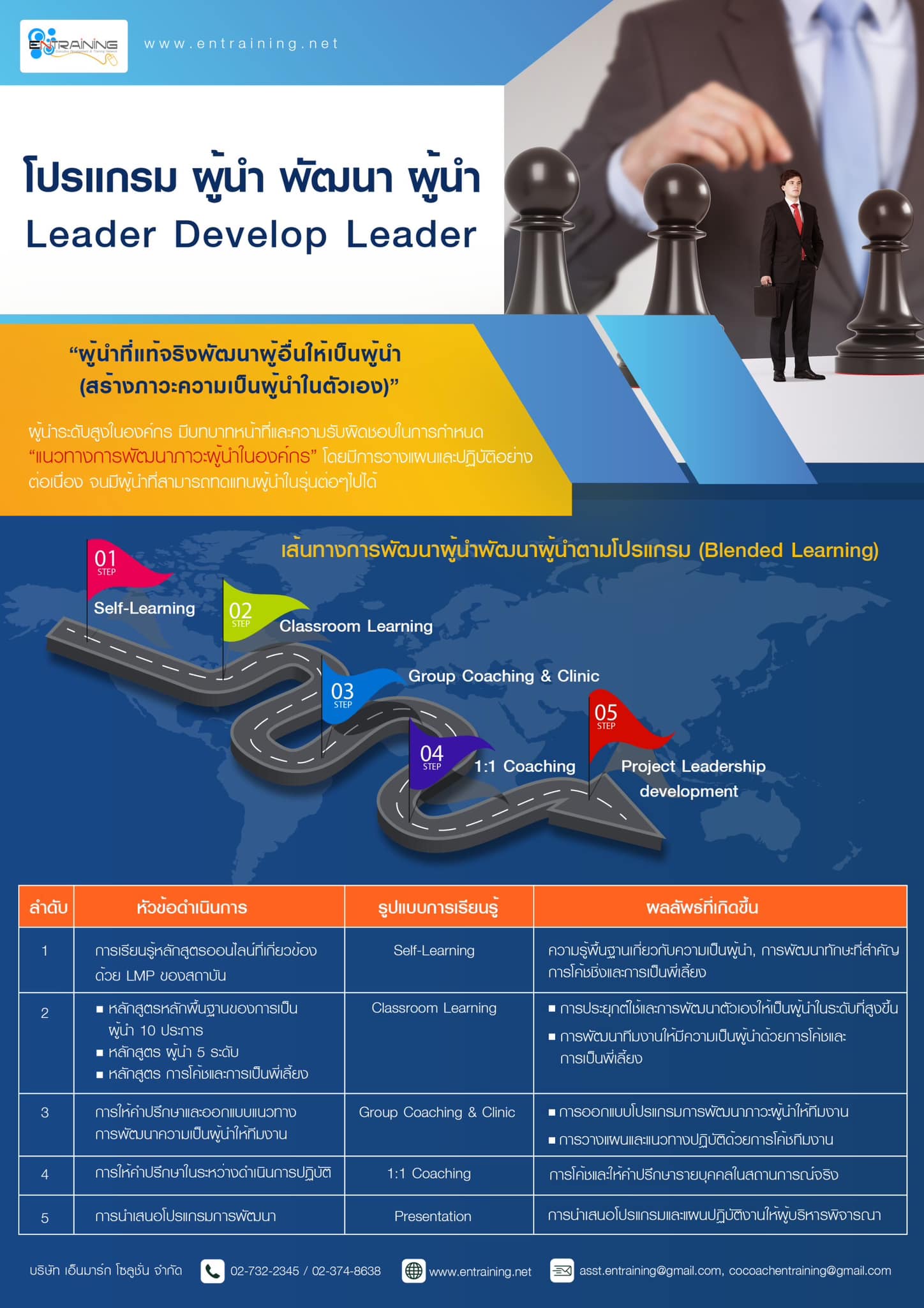 | 1 | โปรแกรมผู้นำพัฒนาผู้นำ (Leader Develop Leader) | Leadership | อาจารย์ ปกรณ์ วงศ์รัตนพิบูลย์ | 29 ม.ค. 2568 | รายละเอียด | https://www.entraining.net/program/โปรแกรมผู้นำพัฒนาผู้นำ/ |