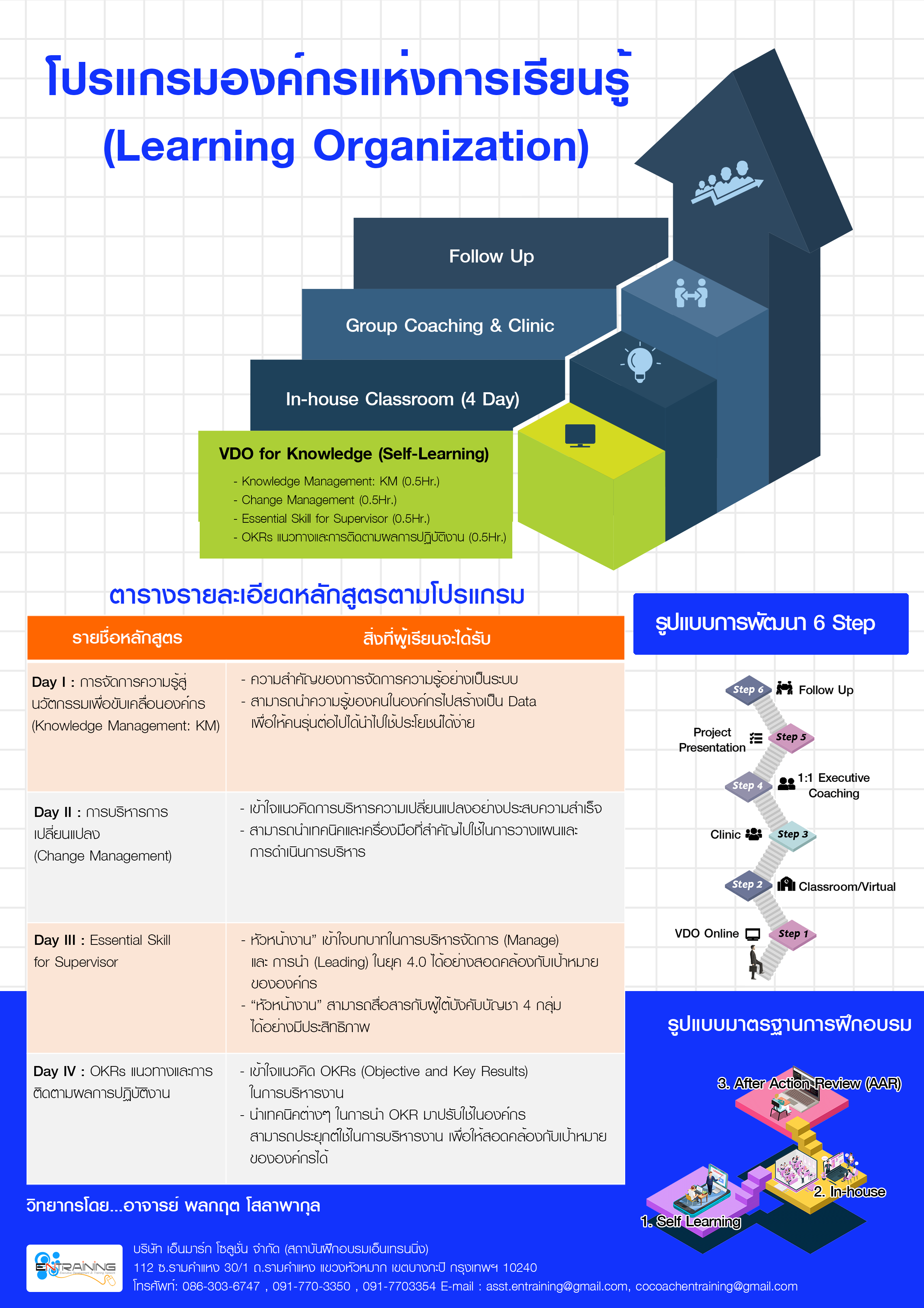 | 9 | Facilitation for KM Program | Facilitative | อาจารย์ อิสรา วิไชยคำมาตย์ | 1 พ.ย. 2565 | รายละเอียด | https://www.entraining.net/program/Facilitation-for-KM-Program/ |
